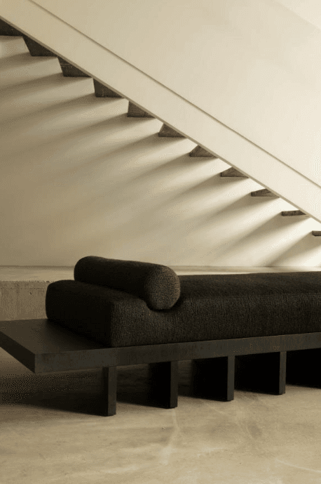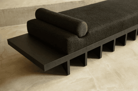 Sharp, directional shadows play across the rhythmic wooden fins of the Scaled 1, an architectural daybed where Isabelle Stanislas explores the intersection of structural rigor and tactile comfort. The design team juxtaposed the charcoal bouclé of its monolithic cushion and bolster against a dark-stained timber base, creating a low-slung silhouette that serves as a functional sculpture for high-concept, expansive galleries.